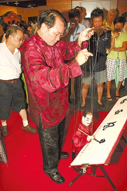 來自福建連城的木偶書法大師李明卿,在現(xiàn)場表演垂線木偶手寫書法絕技,看得現(xiàn)場民眾嘖嘖稱奇。(圖片來源:臺灣《中國時報》)