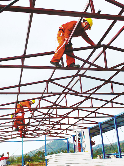 圖為大陸援臺(tái)技術(shù)人員正在組裝活動(dòng)板房。本報(bào)記者 孫立極攝