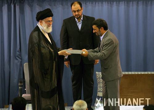 8月3日,在伊朗首都德黑蘭,伊朗最高領袖哈梅內伊正式批準艾哈邁迪-內賈德為伊朗第10屆總統。這是哈梅內伊(左)當天向艾哈邁迪-內賈德(右)頒發總統委任函。新華社發