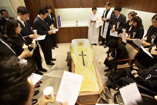 韓國前總統(tǒng)金大中的入殮儀式20日中午在首爾塞弗倫斯醫(yī)院臨時(shí)靈堂舉行。
