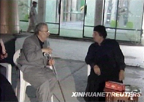這張8月21日的視頻截圖顯示,利比亞領導人穆阿邁爾卡扎菲(右)在利比亞首都的黎波里與提前獲釋回國的洛克比空難制造者邁格拉希交談。邁格拉希身患晚期前列腺癌,經過利比亞官員與蘇格蘭司法部門的協商,邁格拉希提前結束在蘇格蘭的刑期。美國白宮發言人吉布斯21日抨擊利比亞方面為提前獲釋回國的洛克比空難制造者邁格拉希舉行歡迎活動。新華社/路透