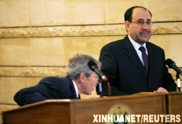 2008年12月14日,在伊拉克首都巴格達(dá)舉行的記者會(huì)上,美國(guó)前總統(tǒng)布什(左)彎腰躲避襲擊。當(dāng)日,一名伊拉克記者在布什與伊拉克總理努里·馬利基(右)召開的聯(lián)合新聞發(fā)布會(huì)上脫下自己的鞋,扔向布什。 新華社/路透