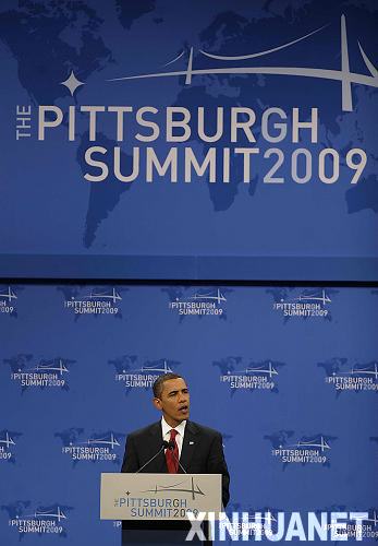 9月25日,在美國匹茲堡市,美國總統奧巴馬在二十國集團峰會后舉行的記者會上回答記者提問。新華社記者張巖攝