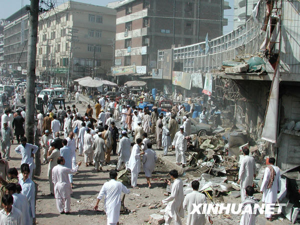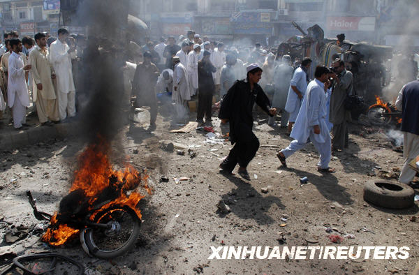 10月9日,巴基斯坦西北邊境省首府白沙瓦市市民在爆炸現場圍觀。新華社發