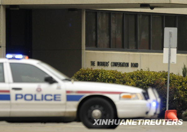 10月21日,一輛警車停在加拿大西部城市埃德蒙頓市工人賠償委員會大樓外。當天上午,一名男子手持步槍闖入該市工人賠償委員會大樓,劫持了數(shù)名人質。新華社/路透