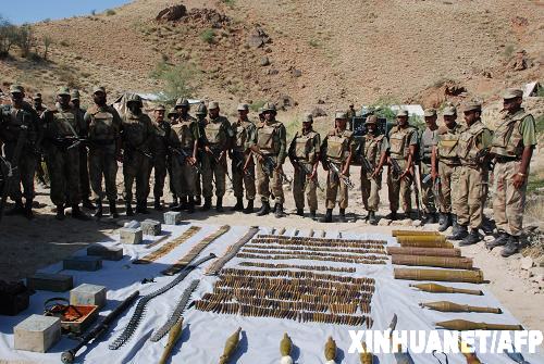 這張巴基斯坦軍方11月2日發(fā)布的照片顯示的是巴軍隊士兵展示在南瓦濟里斯坦地區(qū)進行的軍事行動中繳獲的塔利班武裝分子的武器。巴基斯坦政府軍3日稱已經(jīng)包圍薩拉羅卡,現(xiàn)階段已將這座小鎮(zhèn)團團包圍,圍剿行動已經(jīng)開始。巴基斯坦塔利班運動則稱,棄守薩拉羅卡為塔利班戰(zhàn)略,政府軍已經(jīng)進入陷阱,塔利班即將反攻。新華社/法新