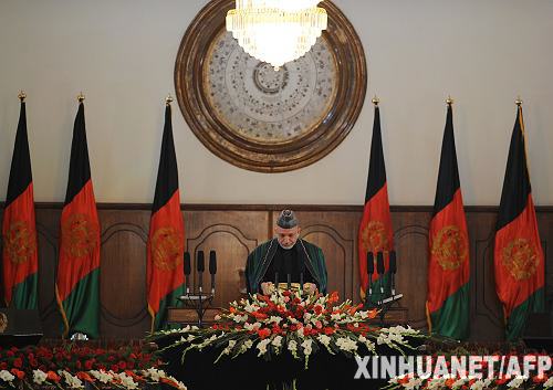 11月19日,在阿富汗首都喀布爾的總統府,阿富汗總統卡爾扎伊宣誓就職,開始其第二個5年任期。新華社/法新