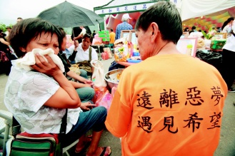 高雄縣甲仙鄉(xiāng)小林村罹難者二七法會(huì),家屬T恤上“遠(yuǎn)離惡夢、遇見希望”是深切心聲。圖片來源:臺(tái)灣《聯(lián)合報(bào)》