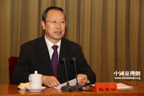 中國和平統一促進會第八屆理事大會23日在京舉行。全國政協副主席、中共中央統戰(zhàn)部部長、大會執(zhí)行主席杜青林受七屆常務理事會委托,作了題為《把握歷史機遇 凝聚強大力量 譜寫推進中國和平統一大業(yè)的新篇章》的工作報告。(中國臺灣網 田云鵬 攝)