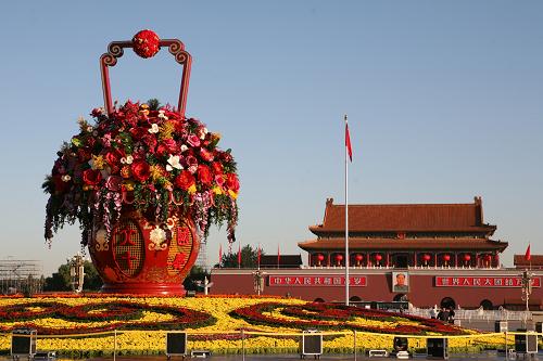 這是擺放在天安門廣場中心的“普天同慶”巨型花籃(10月2日攝)。新華社發(何建勇 攝)