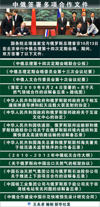 新華網北京10月13日電(記者廖雷、姬少亭)國務院總理溫家寶與俄羅斯總理普京13日在北京舉行中俄總理第十四次定期會晤。期間,雙方簽署了以下文件: