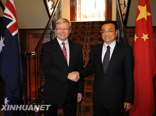 10月30日,中國(guó)國(guó)務(wù)院副總理李克強(qiáng)在澳大利亞首都堪培拉會(huì)見澳大利亞總理陸克文。新華社記者劉建生攝