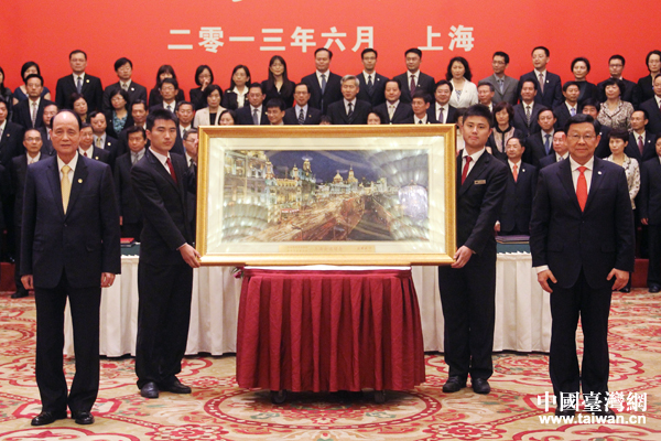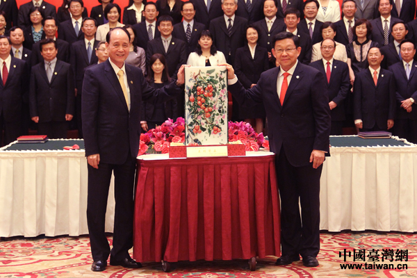 海協會會長陳德銘向臺灣海基會董事長林中森贈送禮物。(中國臺灣網 于斯文 攝)