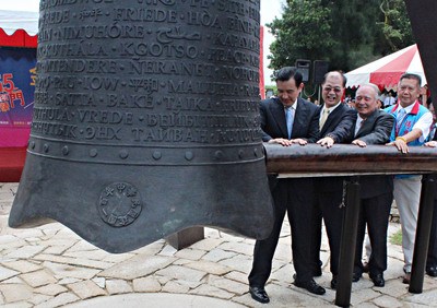 八二三炮戰(zhàn)55周年,23日在金門古寧頭和平紀念園區(qū)舉辦敲和平鐘祈福活動,馬英九(左起)與縣長李沃士等人敲響和平鐘。臺灣“中央社”