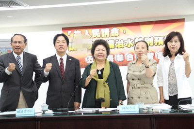 屏東縣長曹啟鴻(左起)、臺南市長賴清德、高雄市長陳菊、嘉義縣長張花冠、云林縣長蘇治芬2日在臺南市政府召開記者會,請當局續編治水特別預算。臺灣“中央社”圖