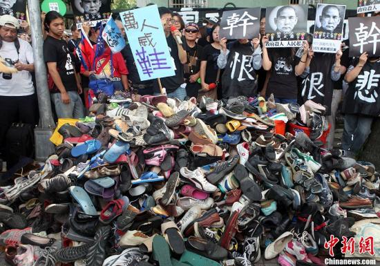 9月29日,雖然中國國民黨推遲了原本決定今天在臺北“國父紀(jì)念館”舉行的第19次全代會。但臺灣關(guān)廠工人連線等民間社團(tuán)下午仍按原計(jì)劃在“國父紀(jì)念館”周圍展開“萬人威鞋、募鞋”活動,訴求民眾生活痛苦得不到改善,以砸鞋、丟鞋的方式表達(dá)不滿。 陳立宇 攝