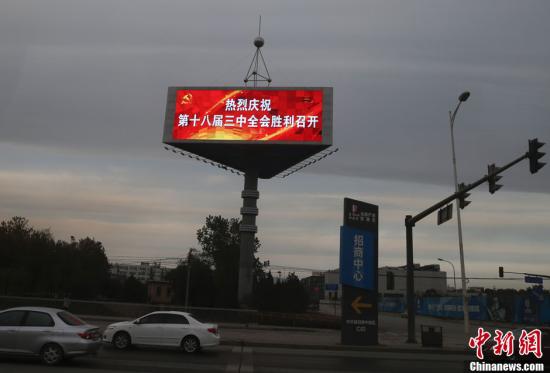 11月9日,中共十八屆三中全會召開,北京街頭一大幅廣告牌上打出“熱烈慶祝第十八屆三中全會勝利召開”的標語。中新社發 劉關關 攝