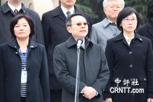 臺灣陸委會主委王郁琦南京中山陵謁陵后在博愛廣場發表談話。(中評社資料圖)