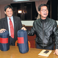 昨天傍晚,十多位民進黨“立委”準備睡袋,進駐“立法院”群賢樓九樓大禮堂,準備夜宿會場。圖片來源:臺灣《聯合報》