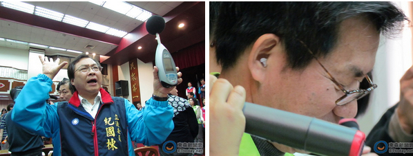 日前審查服貿(mào)過程中,民進(jìn)黨播放高分貝音樂,藍(lán)營“立委”紀(jì)國棟(左)拿出分貝器,連綠營“立委”李應(yīng)元(右)也受不了戴上耳塞。(臺(tái)媒圖)