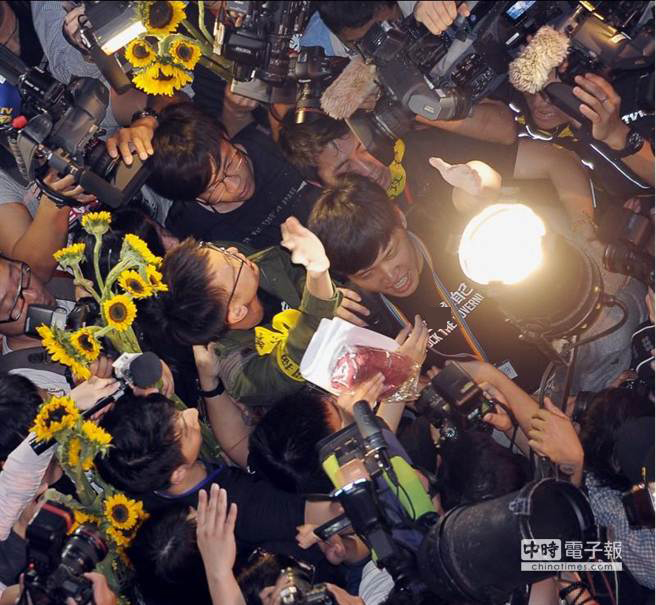 占領(lǐng)立院議場(chǎng)的學(xué)生10日傍晚在發(fā)表聲明后步出議場(chǎng)林飛帆(左)與陳為廷(右)在大批民眾簇?fù)硐伦哌M(jìn)濟(jì)南路。(圖片來(lái)自臺(tái)媒)