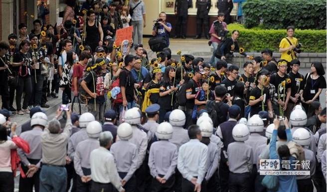 占領(lǐng)“立法院”議場(chǎng)的學(xué)生10日傍晚在發(fā)表聲明后,人手一枝太陽(yáng)花,在警力的戒備下步出議場(chǎng)。(圖片來(lái)自臺(tái)媒)