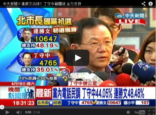 總支持率方面,連勝文48.19%,勝丁守中的35.01%。(中國臺灣網(wǎng) 王文英)