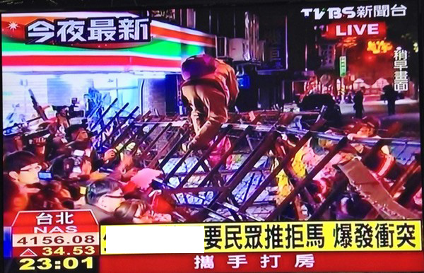 據(jù)報道,在蔡丁貴的帶領下,反核民眾在“立法院”鎮(zhèn)江街與警方爆發(fā)第一波嚴重沖突。民眾用紅色小板凳靠在拒馬上不斷往前推擠,警方則持長棍從另一邊把板凳戳掉,還有人爬上拒馬想沖入“立法院”,立刻被逮捕。現(xiàn)場傳出有人受傷,后續(xù)救護車到現(xiàn)場。