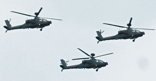 日前慶祝黃埔90周年紀念活動上,臺灣陸軍三架阿帕奇攻擊直升機編隊進行空中分列,接受馬英九校閱,現在傳出機上有尚未合格的飛官,引起爭議。。▓D片來源:臺灣《聯合報》)
