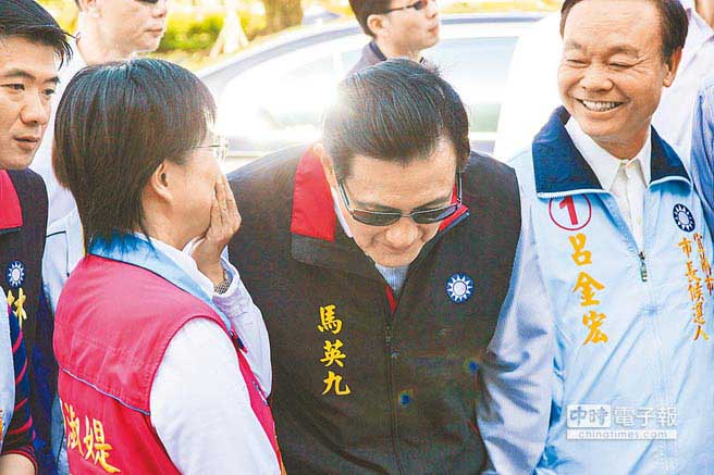 輔選車隊出發前,馬與黨內各候選人合影,邱淑媞見馬英九戴著墨鏡,上前咬耳朵提醒:“戴墨鏡拍照像黑社會啦!”馬立即拿下墨鏡,并幽默妙答:“對喔,這樣就拍不到我美麗的眼睛了!