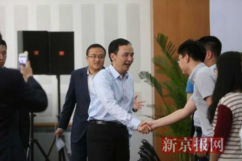朱立倫與座談會上師生握手。新京報記者 周崗峰 攝