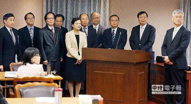 臺灣“立法院內政委員會”5月6日邀請相關官員項目報告國民黨主席朱立倫訪陸行之適法性,臺上陸委會主委夏立言(右起)、“內政部長”陳威仁、“銓敘部長”張哲琛、“經濟部長”鄧振中及6位參與國共論壇的臺當局官員一度排排站備詢。(中時電子報圖 姚志平攝)