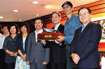 昨天,張志軍接受了“金門刀王”吳增棟(右)現(xiàn)場(chǎng)制造的“勇士鋼刀”。