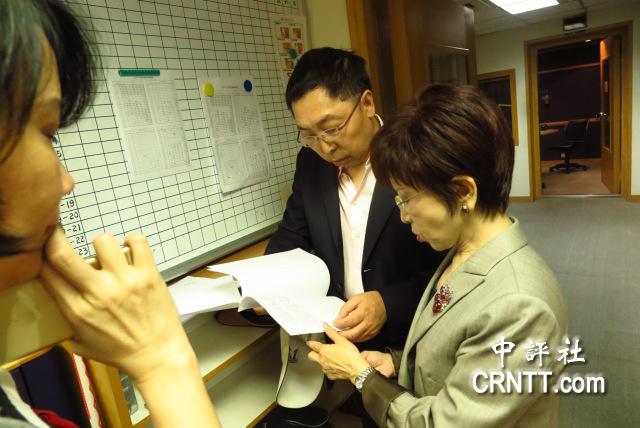 洪秀柱拿出兩份講稿,請?zhí)葡纨垺㈥慀P馨等資深名嘴,給予更專業(yè)的意見。(中評社 彭媁琳攝)