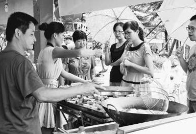 6月14日,游客們在兩岸特色廟會上品嘗美食。徐林攝