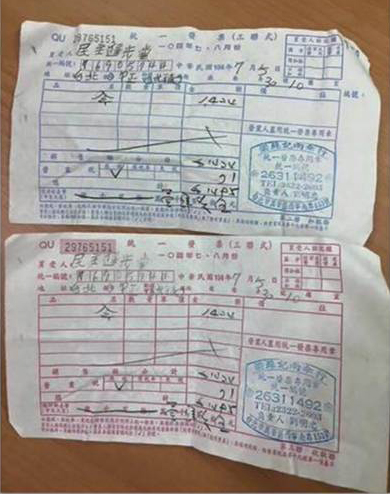 “課綱微調(diào)的真相”臉書粉絲團(tuán)日前公布來(lái)自反黑箱課綱北區(qū)社團(tuán)的照片,內(nèi)容是2張購(gòu)買“傘”的收據(jù)打著民進(jìn)黨統(tǒng)編,換言之可向民進(jìn)黨請(qǐng)款。(臉書圖)