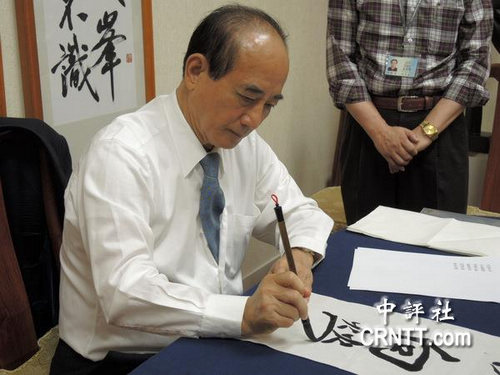 9日上午,王金平利用空閑時(shí)間揮毫寫下“欣欣向榮”四個(gè)字,當(dāng)做明年春聯(lián)題字。(圖自中評(píng)社)