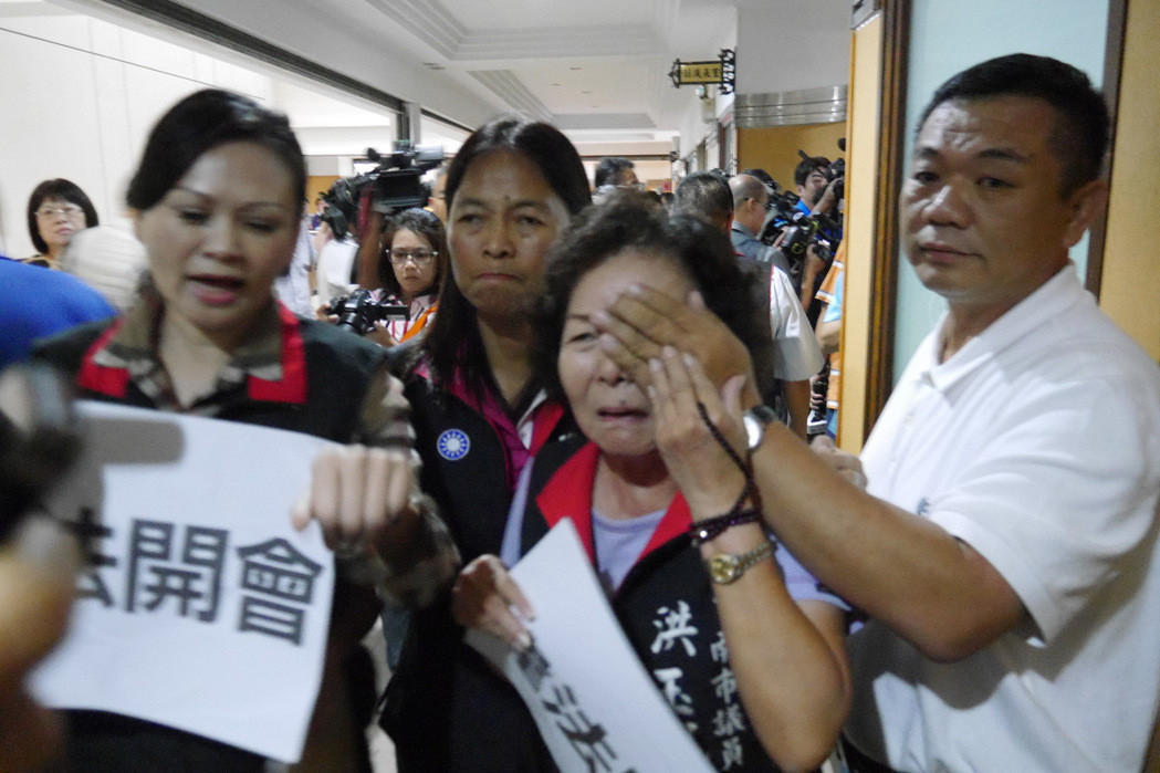 臺南市議會今天發生肢體沖突,國民黨市議員洪玉鳳(右二)被打傷。(圖片來源:臺灣《聯合報》)