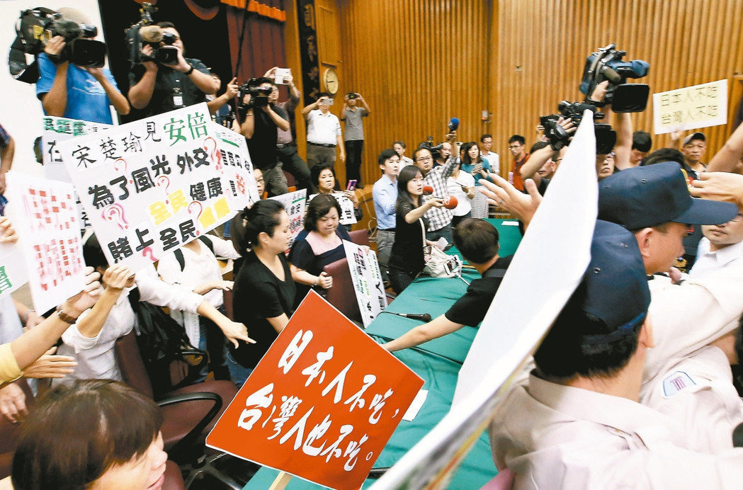 日本食品輸臺(tái)公聽會(huì)臺(tái)北場日前在臺(tái)當(dāng)局“農(nóng)糧署”舉行,會(huì)議沒開始就大亂,藍(lán)營民代與民眾現(xiàn)場抗議,認(rèn)為會(huì)議名稱應(yīng)改為日本核災(zāi)食品輸臺(tái)公聽會(huì),現(xiàn)場一片混亂。(圖片來源:臺(tái)灣《聯(lián)合報(bào)》)