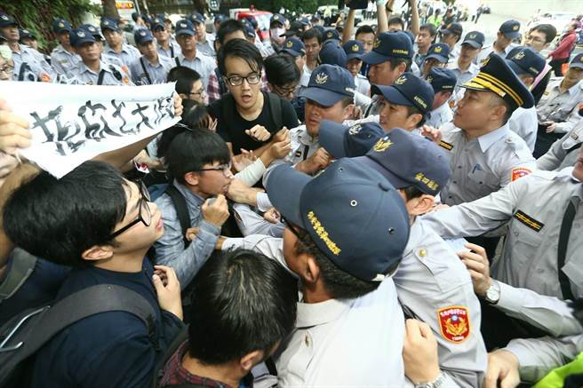 學(xué)生與勞工團(tuán)體在蔡英文官邸外與警察發(fā)生推擠。(圖片來源:臺(tái)灣“中時(shí)電子報(bào)”)