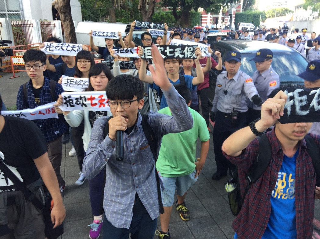 抗議學(xué)生持“拒砍七天假”標(biāo)語轉(zhuǎn)往蔡英文辦公室持續(xù)抗議。(圖片來源:臺(tái)灣《聯(lián)合報(bào)》)