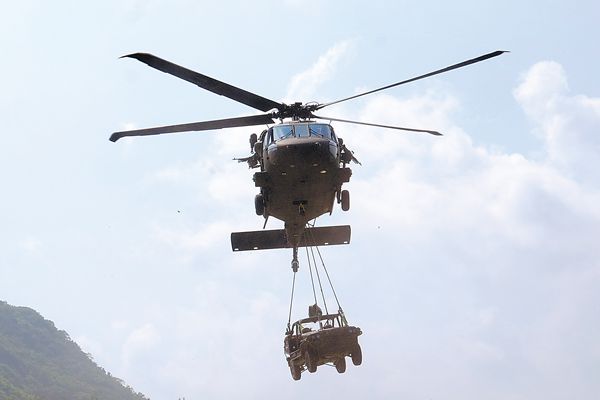 在今年8月臺灣“漢光軍演”中,一架美制“黑鷹”直升機吊起一輛吉普車。