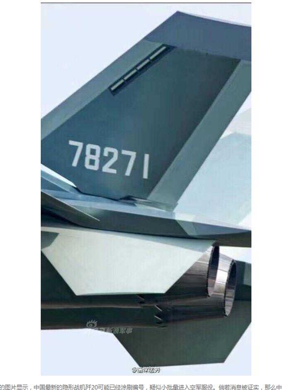 據(jù)臺灣“中央社”12月7日報道,雖然這張照片只有飛機的尾部,但可以判斷是大陸最先進的戰(zhàn)機殲-20。照片顯示,殲-20垂尾印上了“78271”的編號,這是殲-20首次印上5位數(shù)字的編號,大陸媒體形容這疑似“服役編號”,換言之,殲-20已入列服役。