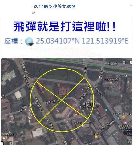 中國臺灣網1月4日訊 臺灣網友在Facebook成立“2017罷免蔡英文聯盟”社團,日前卻有人以谷歌地圖清楚標示臺灣地區領導人蔡英文官邸坐標,并向大陸解放軍喊話:“飛彈(導彈)就是打這里(官邸)啦!”,在島內引發爭議。對此,蔡英文辦公室于3日晚間作出回應。