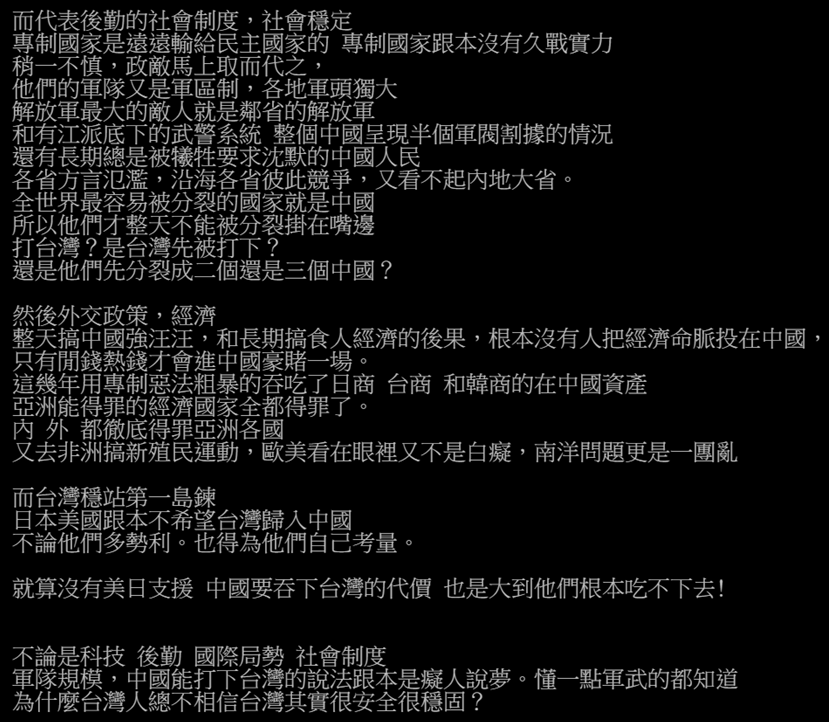 緊接著,文章對大陸軍力進行了貶損,“整個解放軍到現在的2016年的最大兵力投射一周才一萬人,而且還不能有船被射掉,攻臺根本癡人說夢。他們連我們飛彈射過去了還不知道,根本靶艦級海軍。”