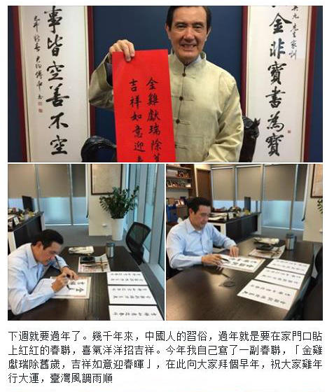 據(jù)臺灣《中國時報》電子報報道,馬英九今天在社交網(wǎng)站發(fā)文表示:下周就要過年了。幾千年來,中國人的習(xí)俗,過年就是要在家門口貼上紅紅的春聯(lián),喜氣洋洋招吉祥。今年我自己寫了一副春聯(lián),“金雞獻瑞除舊歲,吉祥如意迎春暉”,向大家拜個早年,祝大家雞年行大運,臺灣風(fēng)調(diào)雨順。
