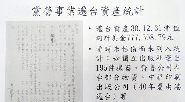 報告書也提到,據1949年12月31日統計,黨營事業遷臺資產約計77萬7598.79美元,換算新臺約8.85億元。另有未估價而未列入統計的設備,如獨立出版社運出195件機器、六魯公司在臺部分物資、中華印刷出版公司等。(中國臺灣網 王思羽)