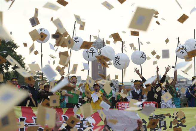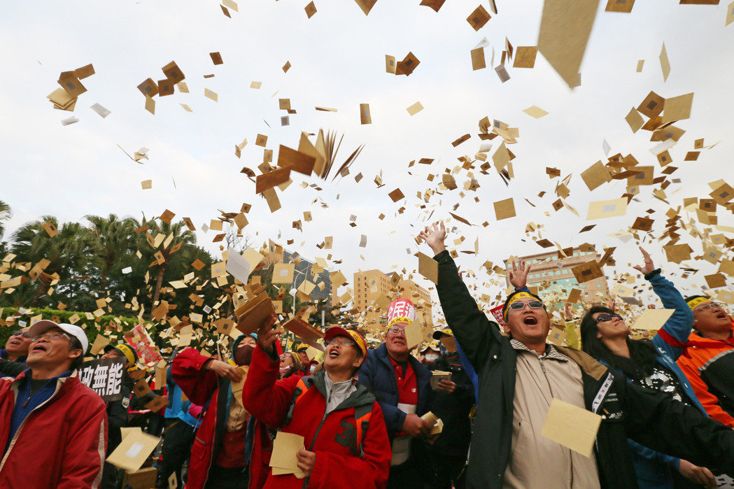 臺灣“軍公教勞”團(tuán)體舉著白燈籠撒紙錢,為蔡英文當(dāng)局“送終”。(圖片來源:臺灣《聯(lián)合報》)