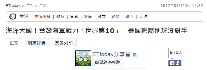 據臺灣“東森新聞云”1月23日稱,近日,一則外媒評選2017年世界前10強海軍的消息在臺灣引發熱議。據稱,臺灣名列第10,“屬于世界頂尖等級的海洋強權”。