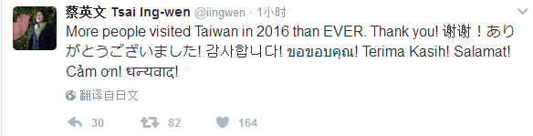 臺灣主計總處日前發布“國情統計通報”指出,2016年赴臺旅客人數達1069萬,創歷史新高。蔡英文9日在推特用9種語言,表達感謝;其中,“謝謝”兩字用的是簡體中文。環球網記者發現,在這9鐘語言中,英語被排在了第一位,而中文排在第二位,并且使用的是簡體字。